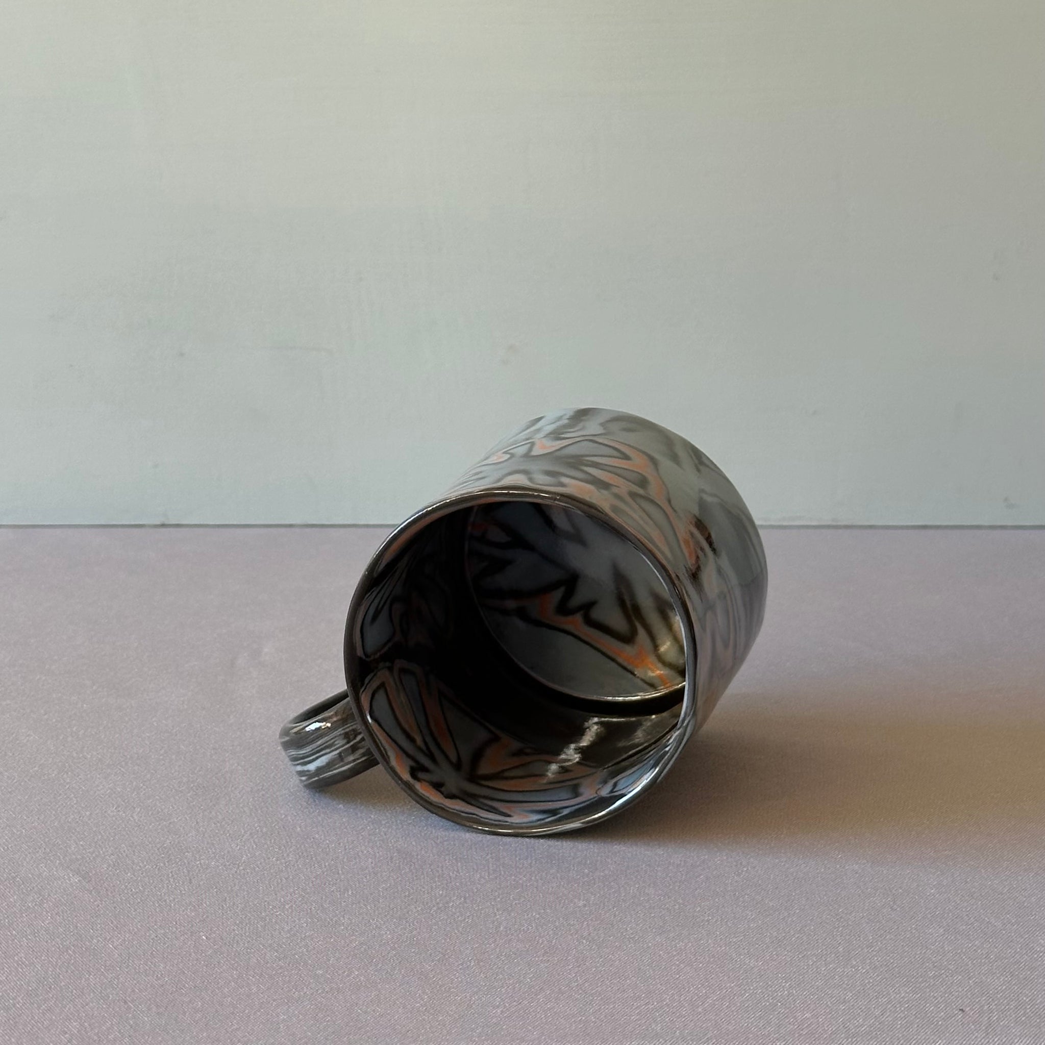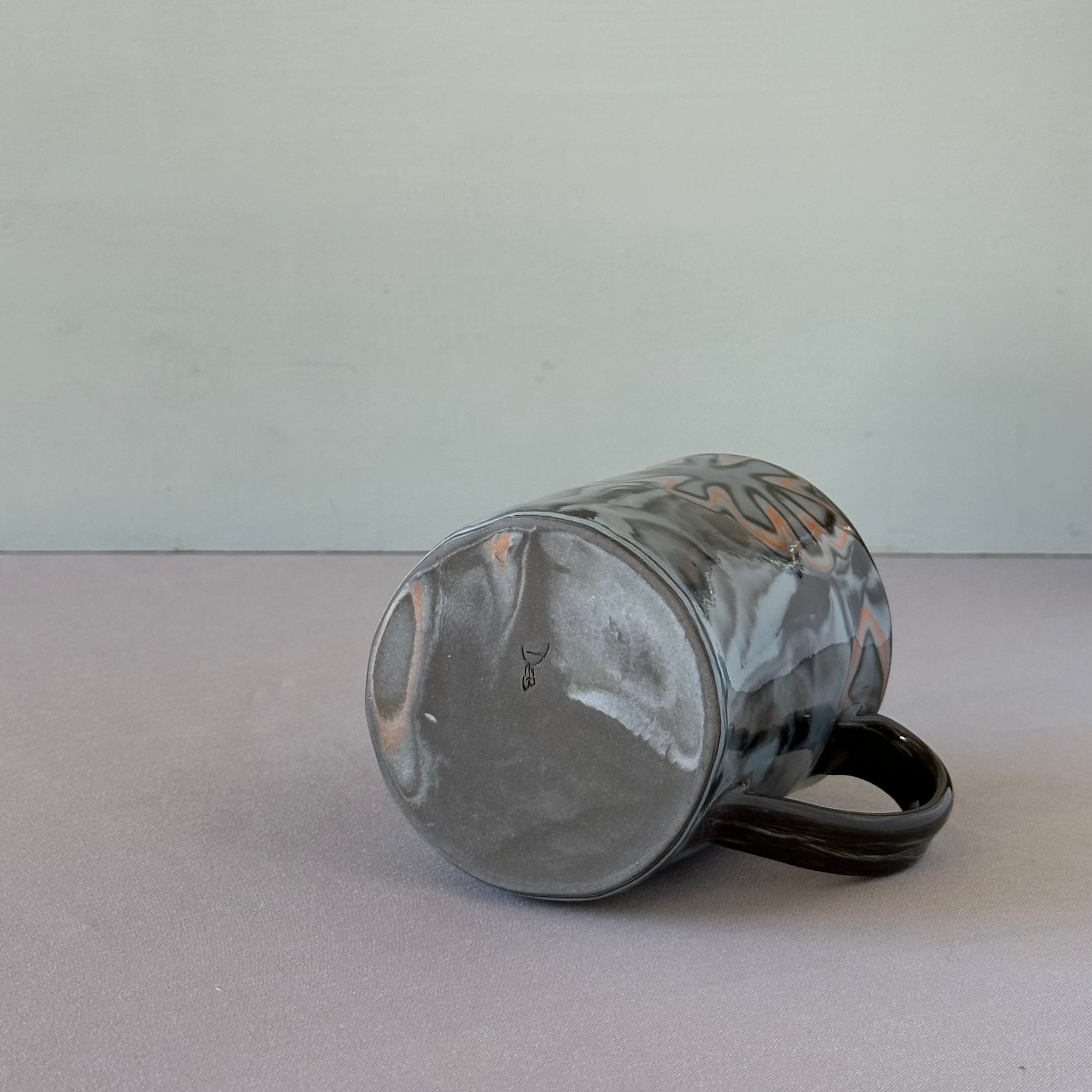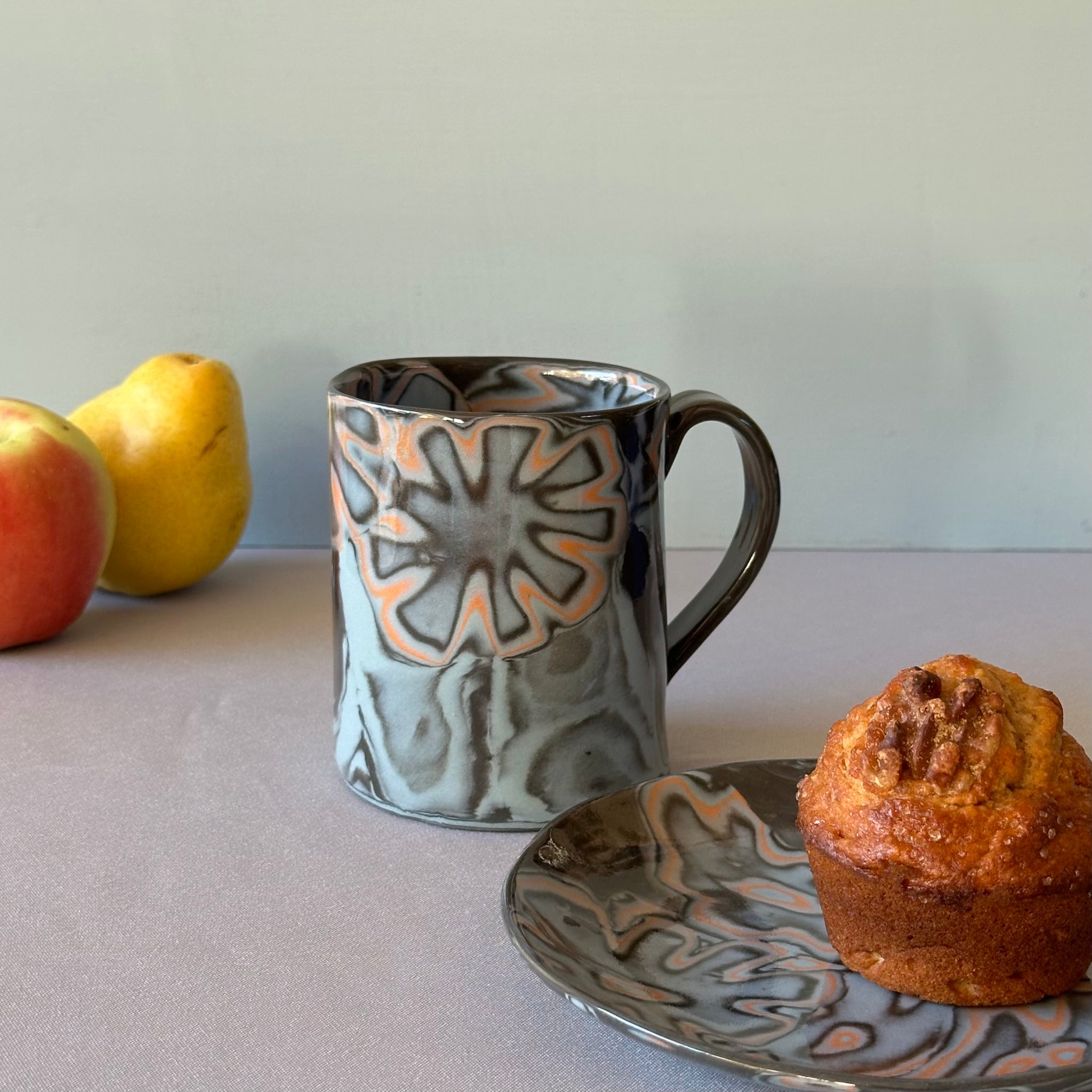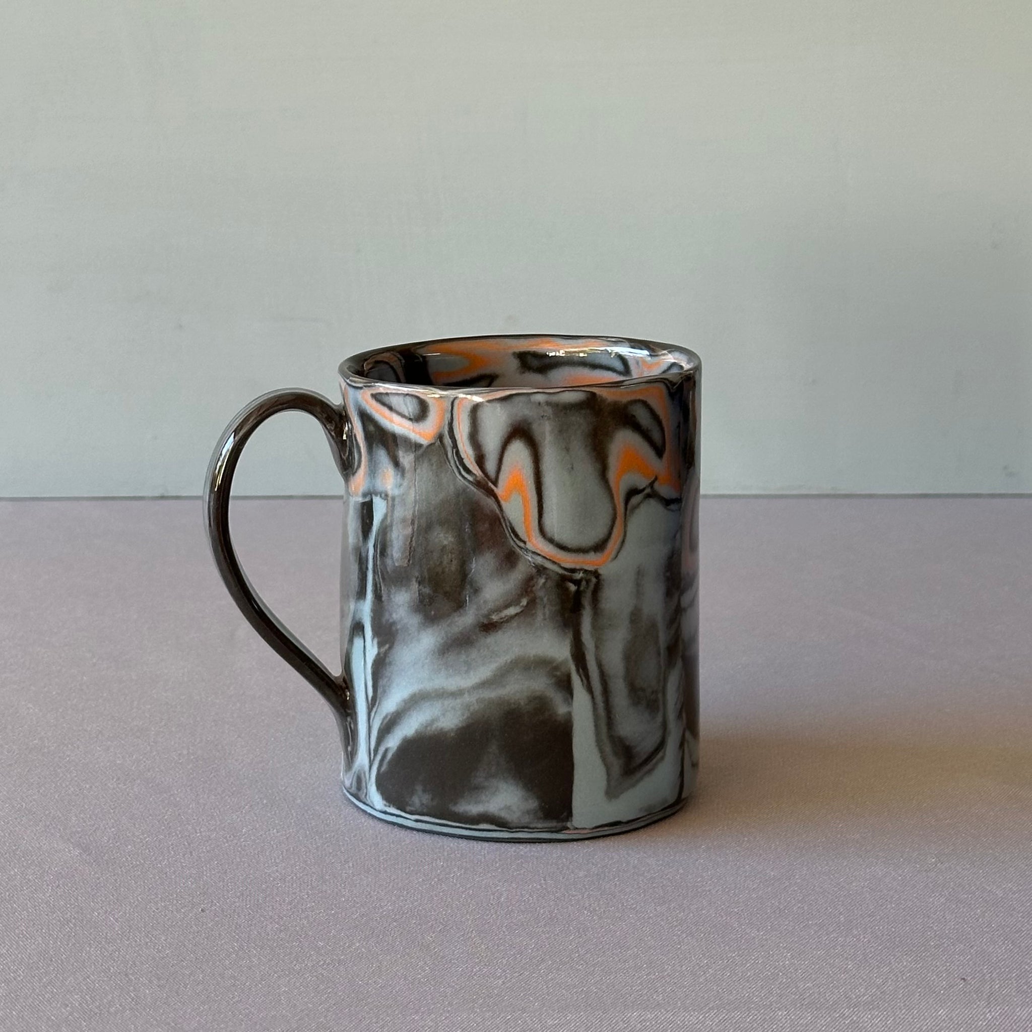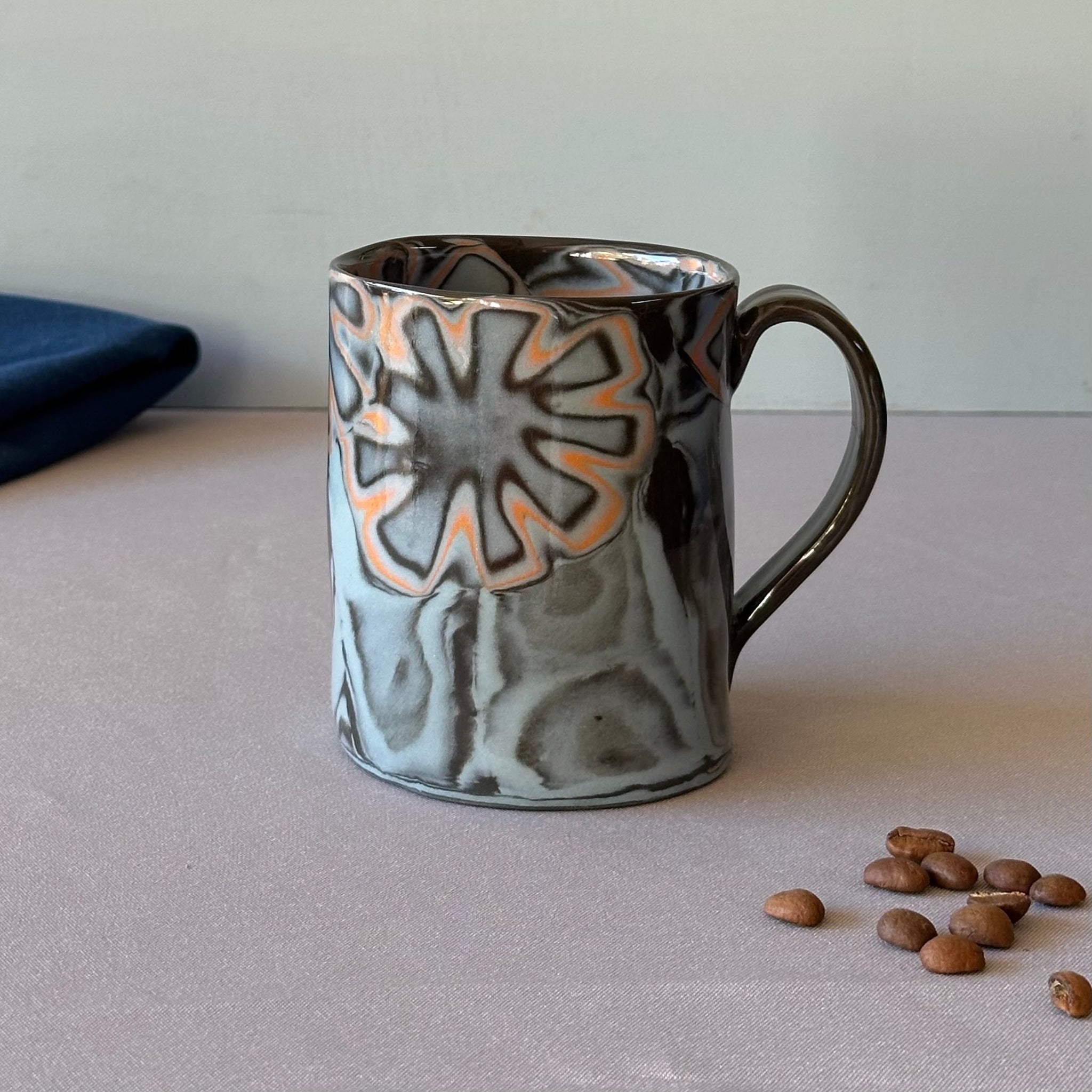 Slab build mug - black clay with laminated blue, black and orange pattern. All of the color is in the clay, with a clear glaze. Plate with same pattern is available separately.