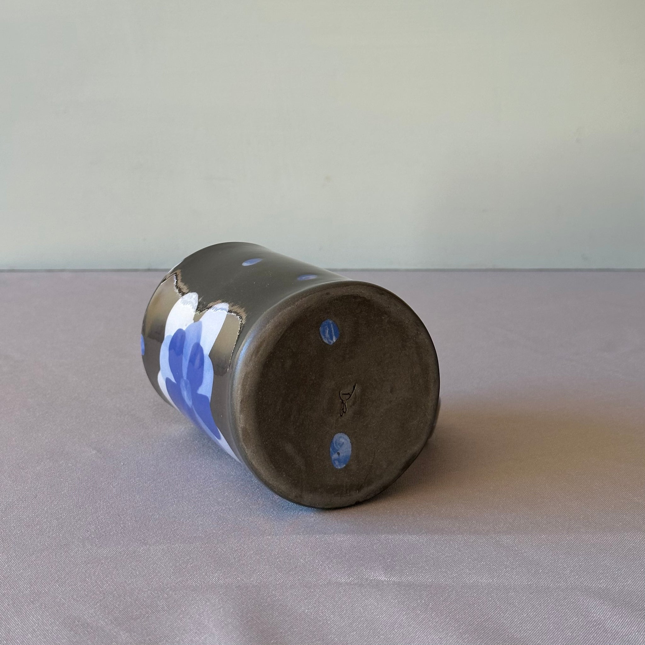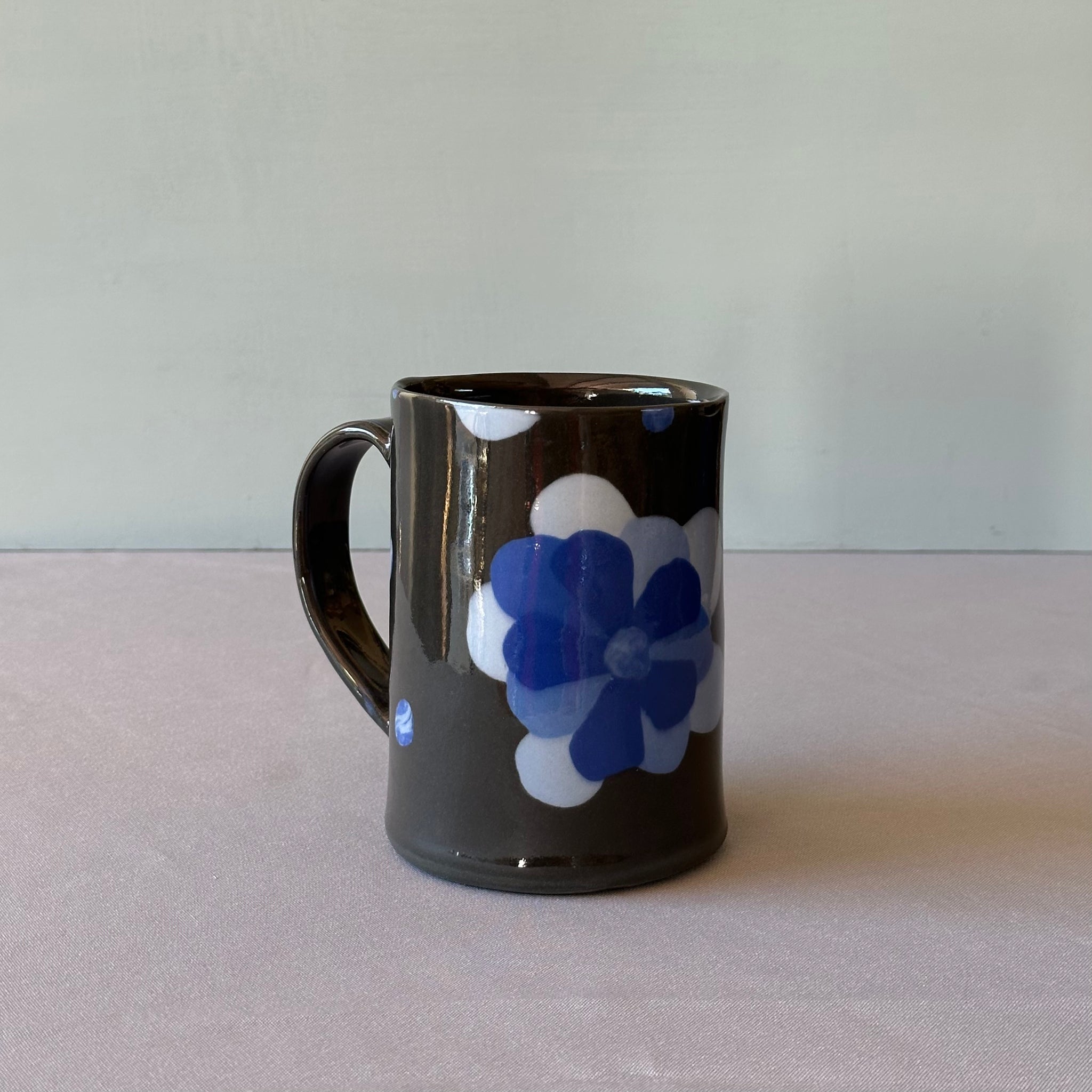 Slab built mug formed from black clay which has been laminated with blue flowers. All of the color is in the clay, with a clear glaze.