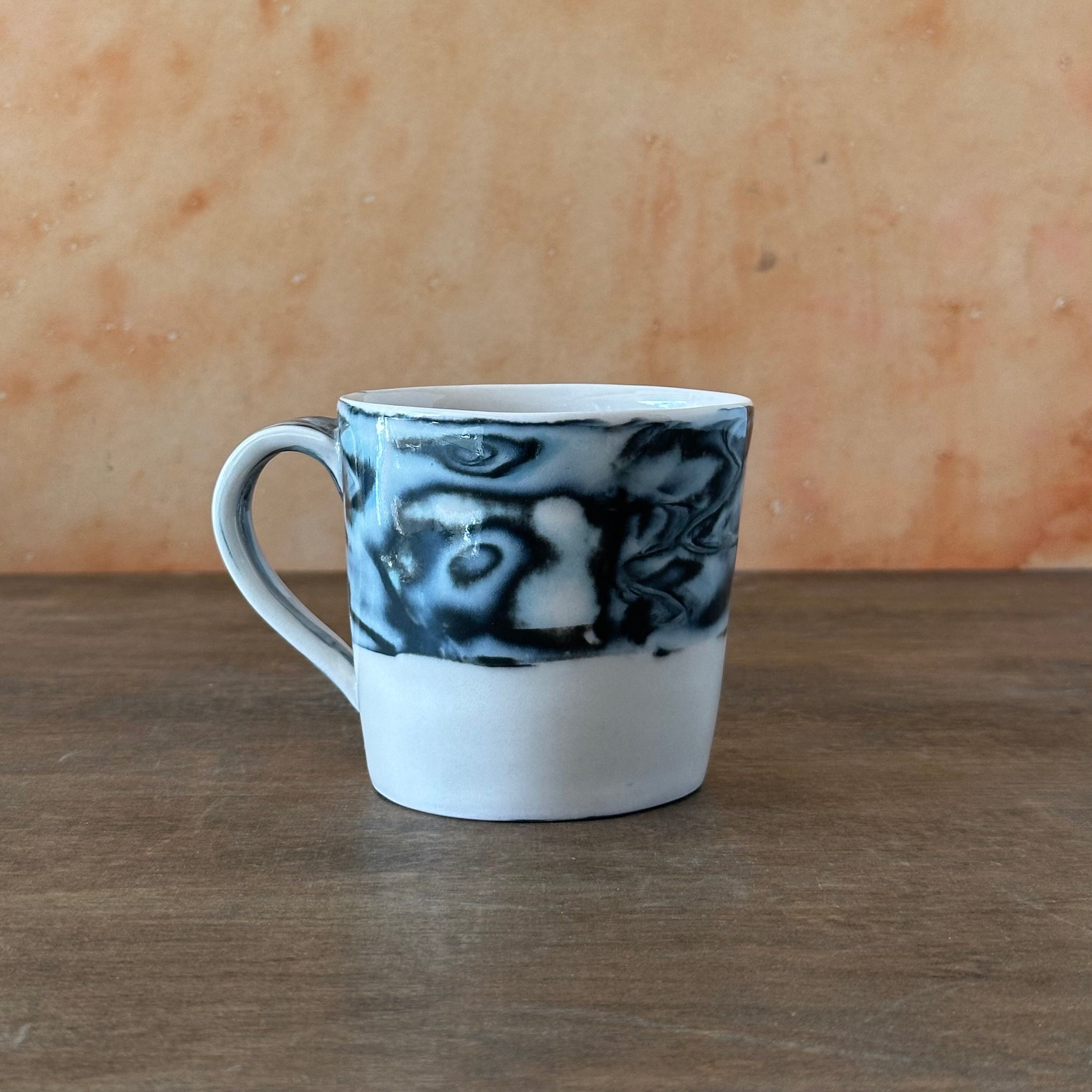 Small white porcelain mug, with black and blue pattern formed in layers of colored clay laminated to the slab. Clear glaze.