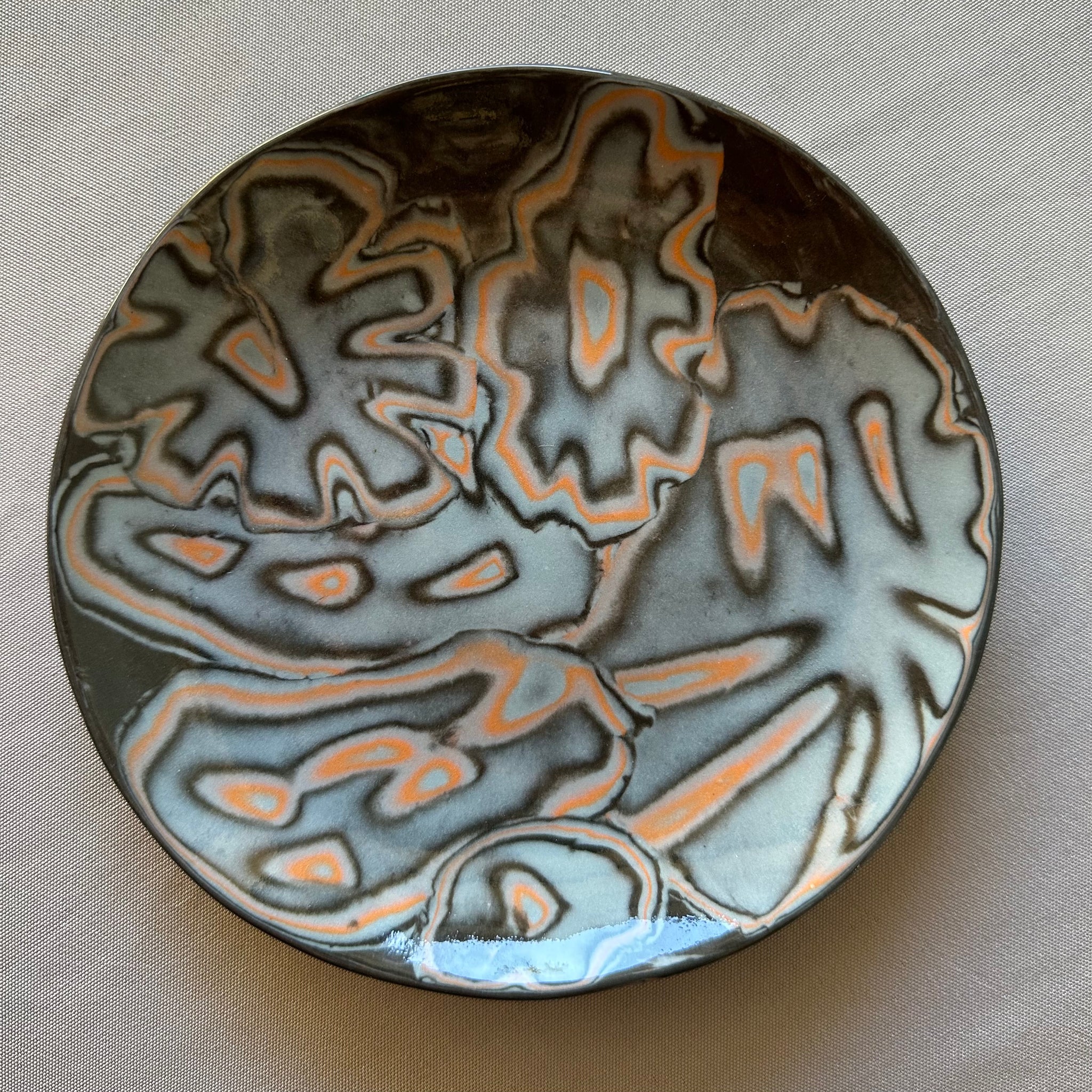 Slab built small plate made from laminated layers of colored clay on a black base using a Mokume Gane technique. All of the color is in the clay and finished with a clear glaze. Dishwasher and microwave safe.