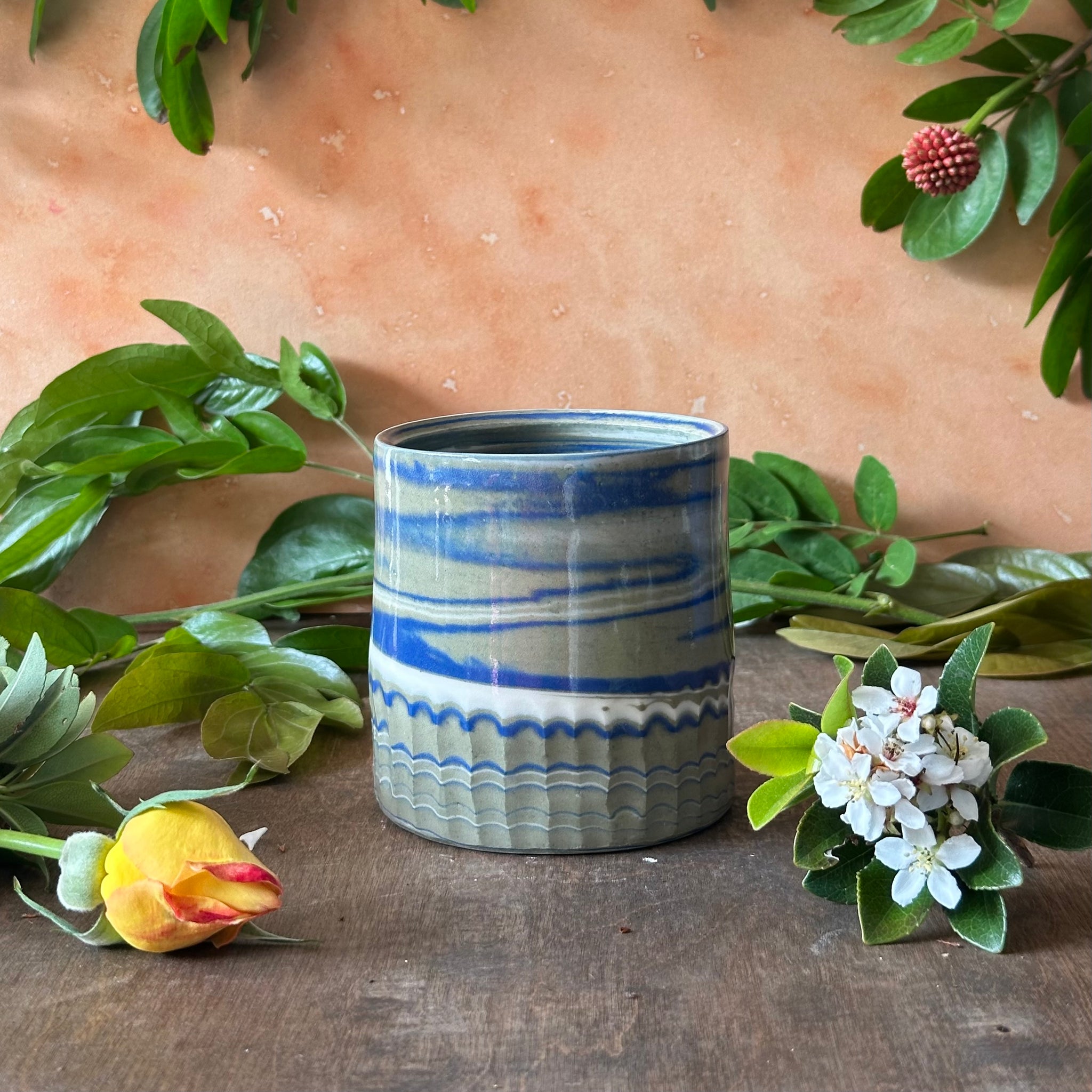 Green speckled clay layered with blue and white porcelain creates striking visual depth in this wheel-thrown vessel. Hand-carved details enhance the neriage technique, showcasing the beautiful interplay of colors throughout. Versatile in function—use it as a vase for small stems or as a tumbler for your favorite beverage. Each piece is unique, reflecting the artisan craftsmanship of the making process.