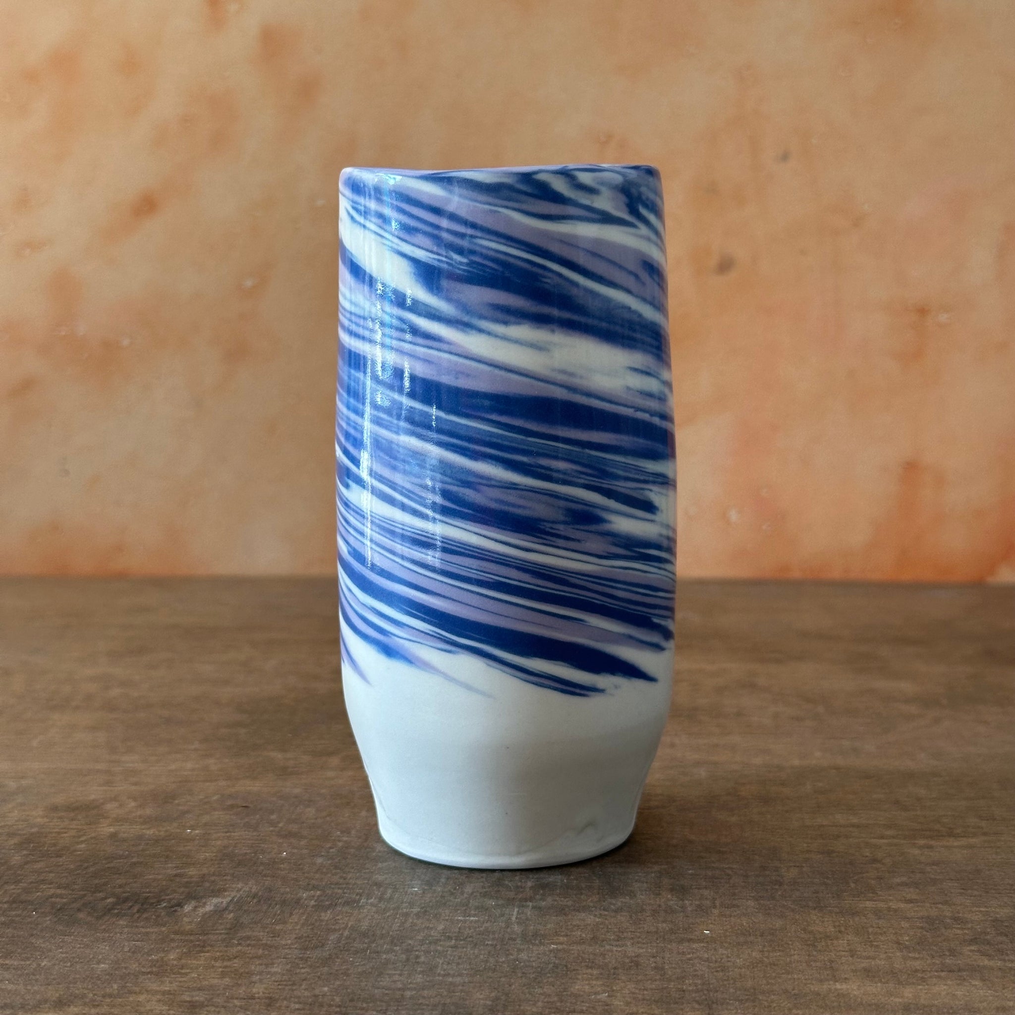 Porcelain vase with blue and lavender clay thrown on the wheel, resulting in a unique swirled pattern. All of the color is in the clay, with just a clear glaze.