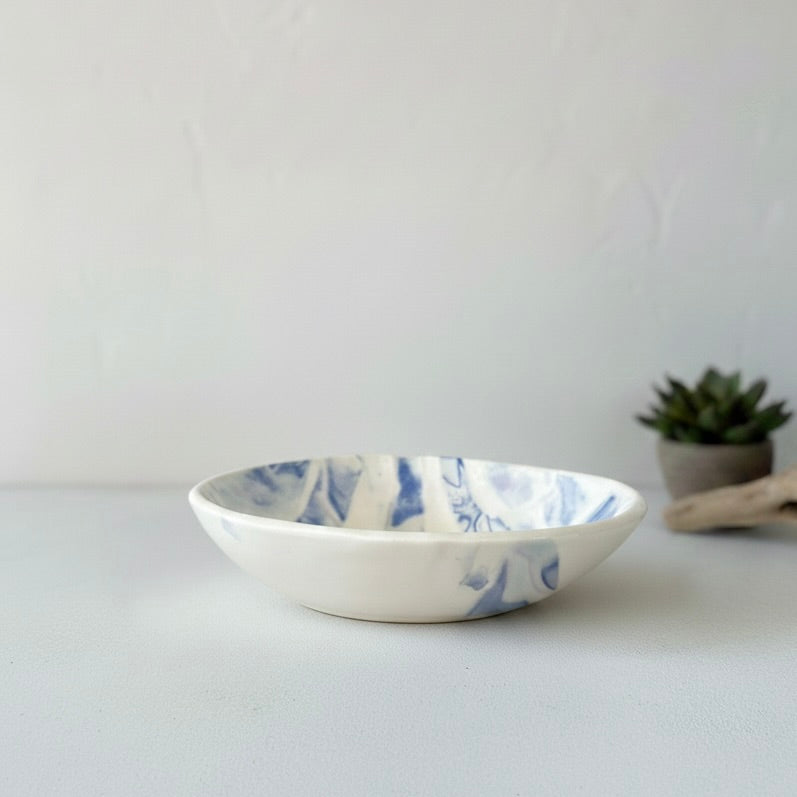 Small shallow bowl, perfect for a little snack or in the kitchen for mise en place. About 5 inches in diameter and an inch tall. Microwave and dishwasher safe.