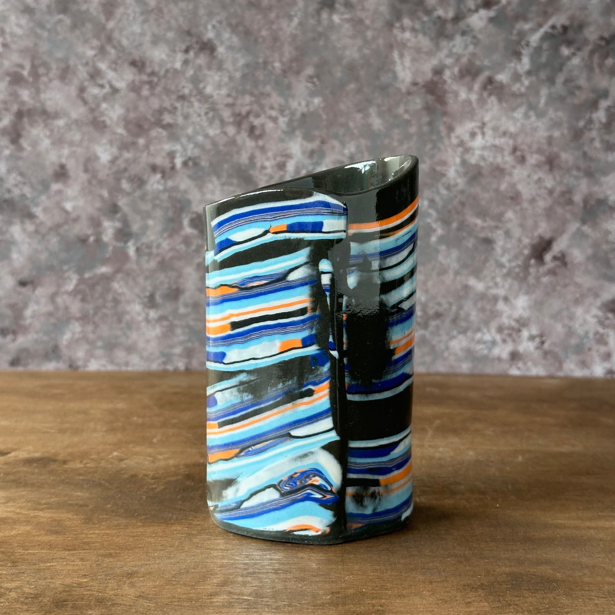 Medium vase made from black clay with laminated blue and orange colored porcelain and a clear glaze.